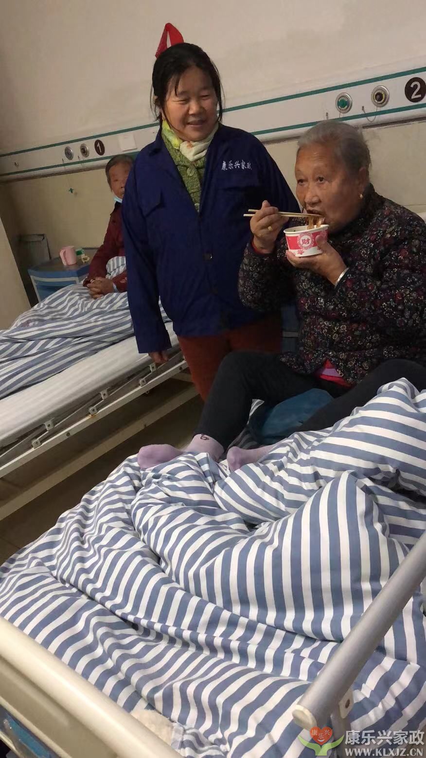 麻城康樂興家政中醫(yī)院護工2022.1.5號案例,上圖我公司護工買好晚飯給病人,病人正在吃著晚飯??禈放d家政王總拍攝于麻城中醫(yī)院。