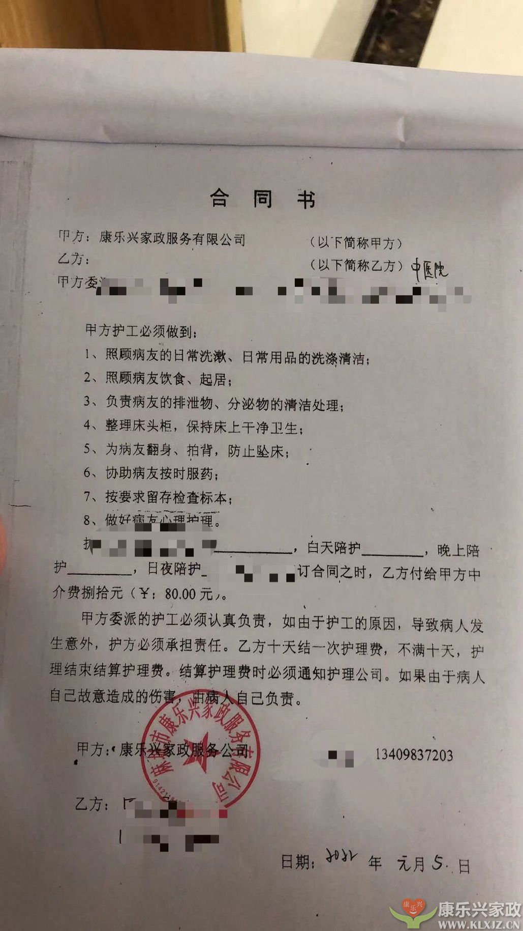 上圖為麻城康樂興家政和該病人的護理合同。